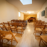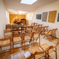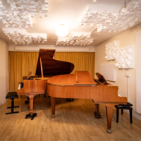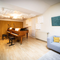 De studio heeft een oppervlakte van 44 m2 (4 x 11m). In de ruimte staan 2 vleugels: een Steinway B (2.11m) een Seiler (1.70m). Daarnaast staan er o.a. een zitbank, twee tafels en diverse stoelen. De inrichting is flexibel: beide vleugels en al het meubilair kunnen naar wens worden verplaatst. Met klapstoelen kan het aantal zitplaatsen tot 30 worden uitgebreid. Er is een keukenblok met een koffiezetapparaat, waterkoker, thermoskannen en ruim voldoende servies.